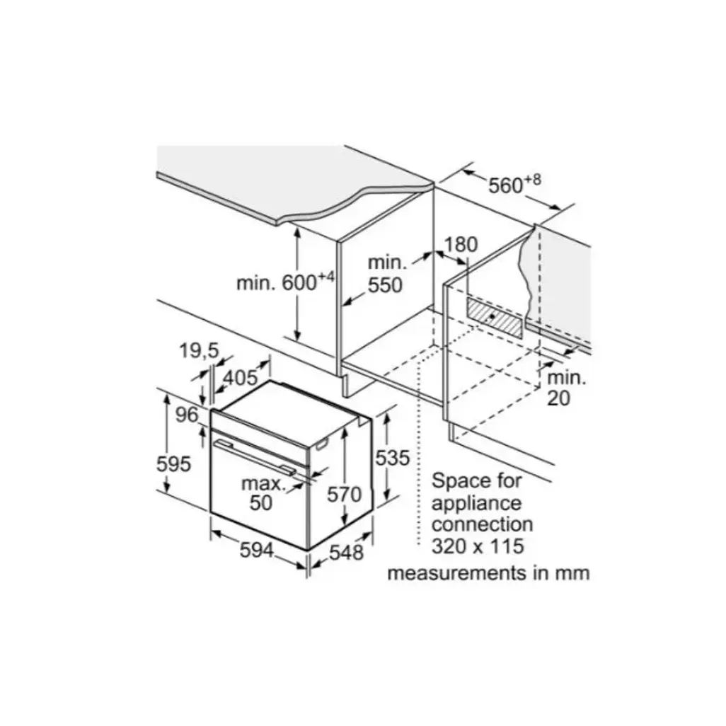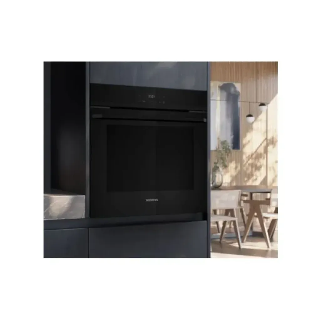 The dimensions for this Siemens 76L Black Built-In Oven are H 595mm (minimum height for installation: 585mm) x W 594mm (minimum width for installation: 560mm) x D 548mm (Depth installation: 550mm) with a weight of 33kg.
