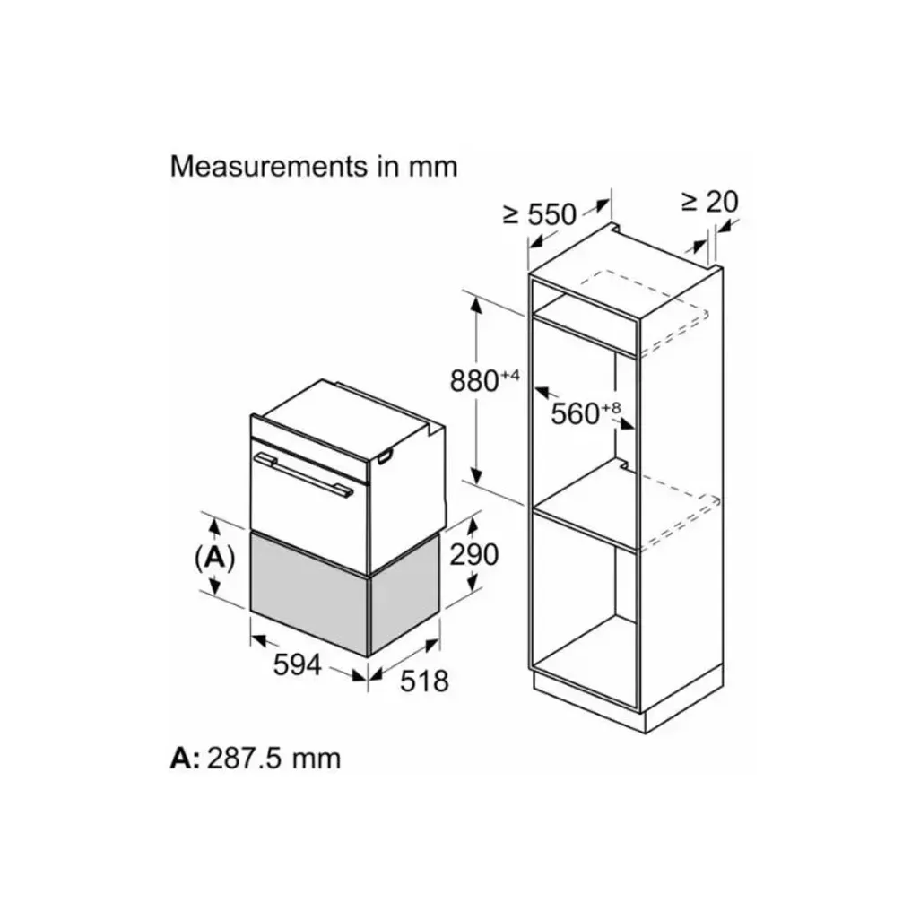 The dimensions for this Siemens 29cm Integrated Warmer Drawer are H 290mm (290mm minimum) x W 568mm (560mm minimum) x D 550mm with a weight of 24.3kg. It comes with a 5 year guarantee.