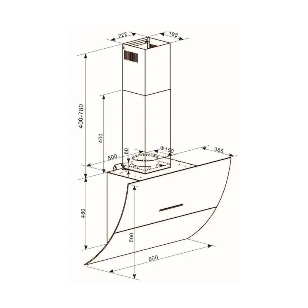 The dimensions for the Falco 60cm Curved Motorised Wall Extractor are H 950mm (1260mm opened) x W 600mm x D 385mm with a weight of 19.6kg. This extractor has a 3 year guarantee. The minimum flute length is 400mm and the maximum length is 780mm or 980mm.