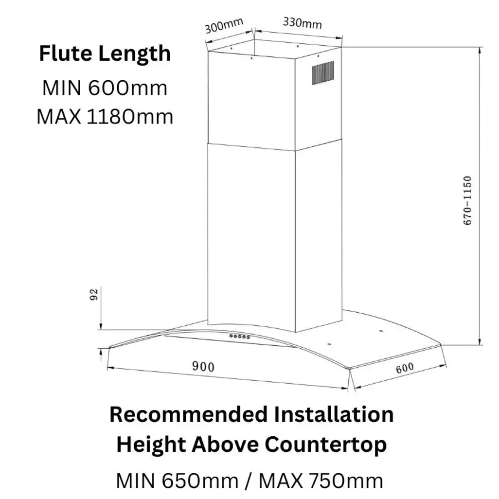 The dimensions of this Falco Wall Mount Extractor Fan are H 670mm - 1150mm x W 900mm x D 600mm.