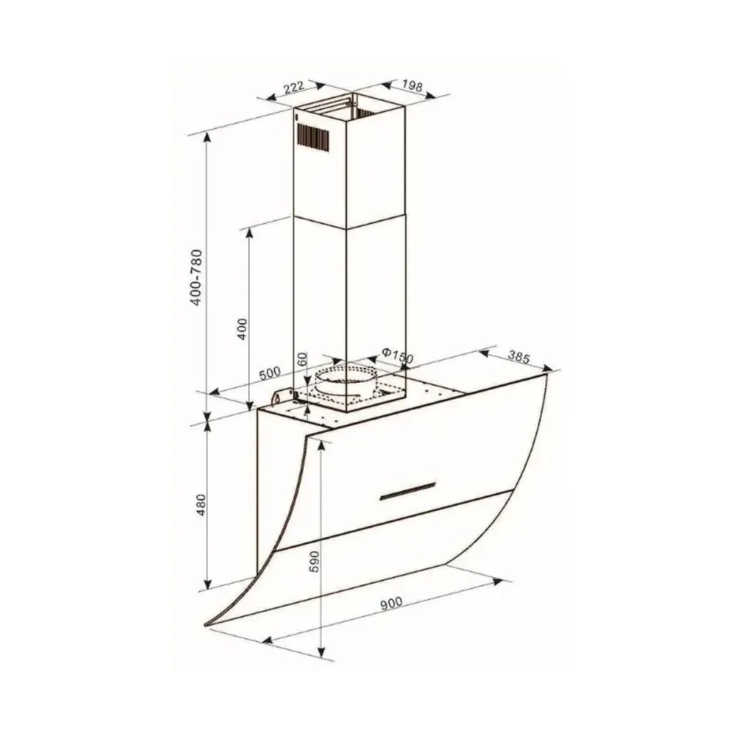 The dimensions for the Falco 90cm Curved Motorised Wall Extractor are H 950mm (1260mm opened) x W 900mm x D 385mm with a weight of 21.8kg. The minimum flute length is 400mm and the maximum length is 780mm. This extractor has a 3 year guarantee.