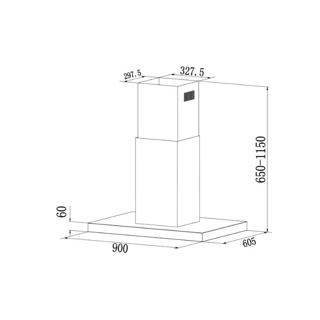 The dimensions for the Falco 90cm Island Extractor are H 650mm-1150mm x W 900mm x D 605mm with a weight of 26kg. The minimum flute length is 600mm and the maximum length is 1180mm. The recommended installation height above the countertop is a minimum of 650mm and maximum of 750mm. This extractor has a 3 year guarantee.
