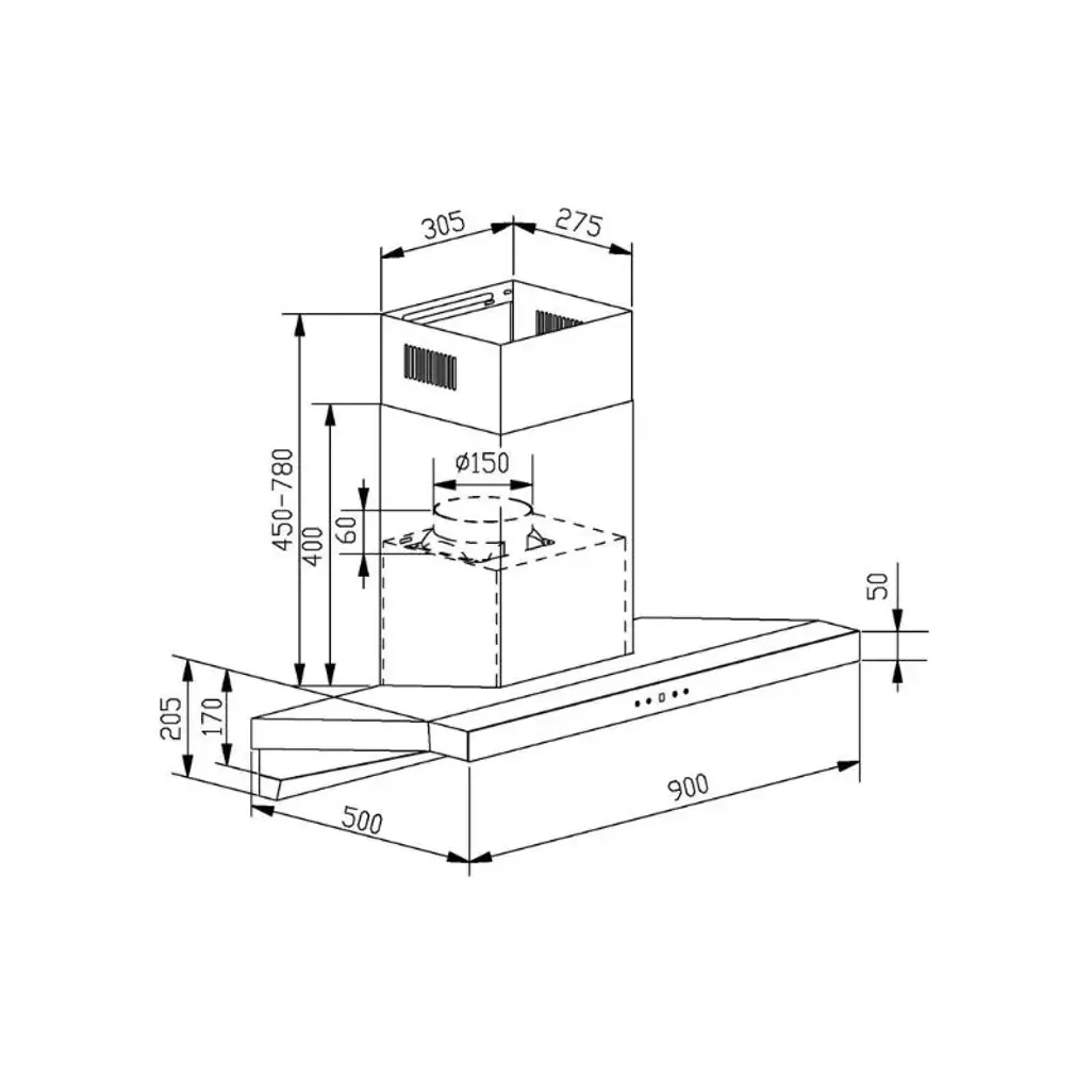 The dimensions of this Falco 90cm Slanted T-Shape Extractor are H 985mm x W 900mm x D 500mm and it comes with a 3-year guarantee.