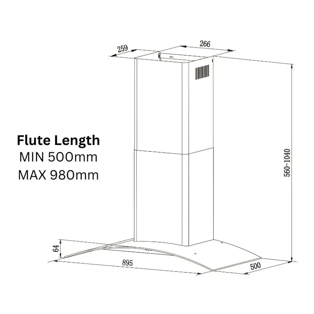 The dimensions of this Falco Wall Mount Extractor Fan are H 560mm - 1040mmx W 895mm x D 500mm.