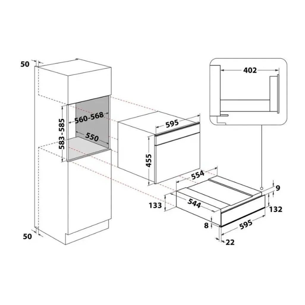The dimensions of the Whirlpool Built-In Warmer Drawer are H 141mm x W 595mm x D 566mm, and there is a 10-year guarantee against yellow and corrosion on the stainless steel finish