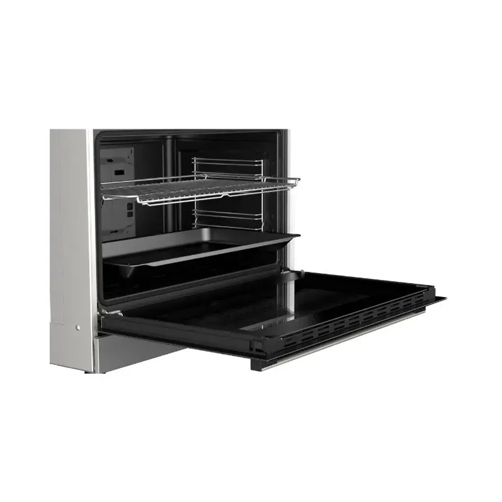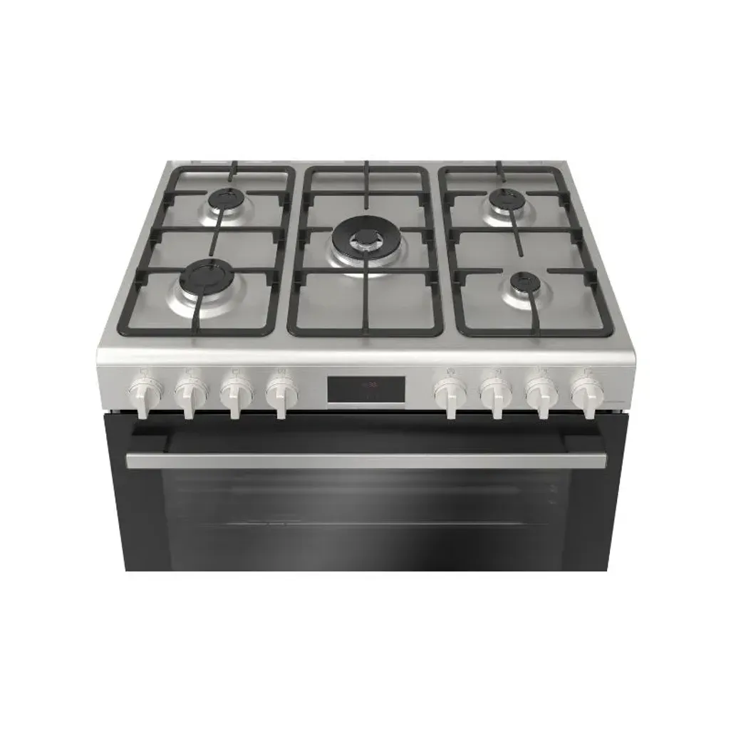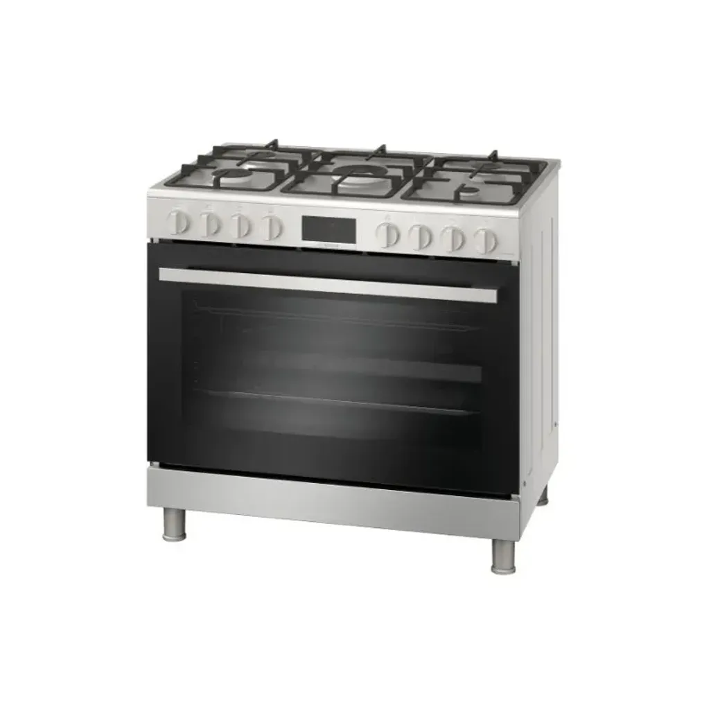 This Bosch 90cm Series 6 Stainless Steel Gas Cooker comes with a gas cooktop that supports cast iron pans. With its large 125L oven capacity, you are able to bake and roast bigger portion meals. There are 5 cooking functions. Enjoy the rotisserie spit that is designed to roast perfectly and delicious chickens. Cook with ease!