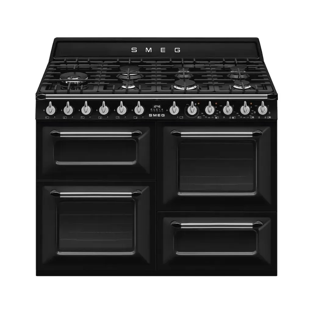 The Smeg 110cm Black Gas /Electric Victoria Cooker have an electric grill function for extra added versatility, ideal for crispy finishes and healthier meals. It's A energy rating that ensures efficient cooking while keeping your energy bills in check. Making it practical and meeting safety with features like the tangential cooling system, thermo-ventilation, and a safety thermostat for peace of mind during every culinary adventure. The electro-mechanical temperature control provides precise adjustments, giving you full command of your cooking process.
