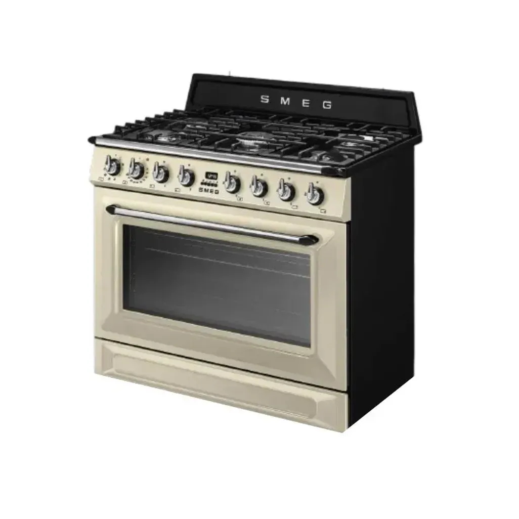Bring timeless elegance and professional performance into your kitchen with the Smeg 90cm Victoria Vintage Cream Gas/Electric Cooker. A classical cooker that is designed with modern innovation, power and style. Perfectly designed for passionate home chefs who want both style and functionality in one statement appliance. It features a spacious 115-litre thermo-ventilated electric oven that offers nine versatile cooking functions, including static, fan-assisted, circulaire, eco mode, and multiple grill options. Whether you are roasting, baking, or grilling, the Vapor Clean system makes maintenance effortless, while the oven’s Ever Clean enamel cavity ensures durability and hygiene.