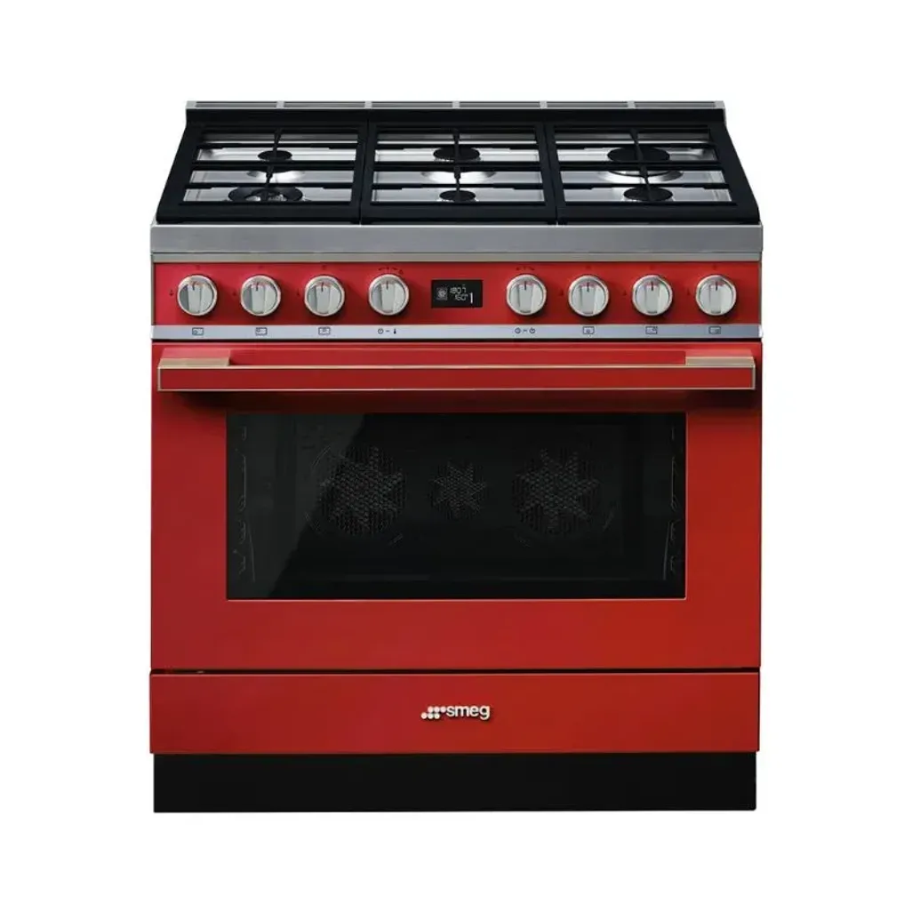 Bring Italian elegance and professional performance into your kitchen with the Smeg Portofino 90cm Fiery Red Gas /Electric Cooker. It is designed to stand out with its bold Fiery Red finish. This freestanding cooker combines style, power, and versatility, making it the perfect choice for passionate home chefs and busy families. Featuring 6 high-performance gas burners, giving you all the space and precision you require to prepare multiple dishes at once. The dual fuel design offers the best of both worlds with fast, responsive gas cooking on top and consistent, even heat distribution in the electric oven below. The 8 easy-to-use control knobs allow you to switch effortlessly between cooking settings so you can achieve perfect results every time.