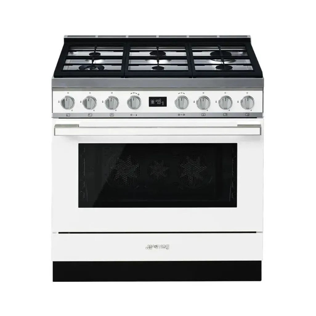 The dimensions of the Smeg Portofino 90cm White Gas /Electric Cooker are H 900mm x W 900mm x D 600mm, and it has a 3-year guarantee.