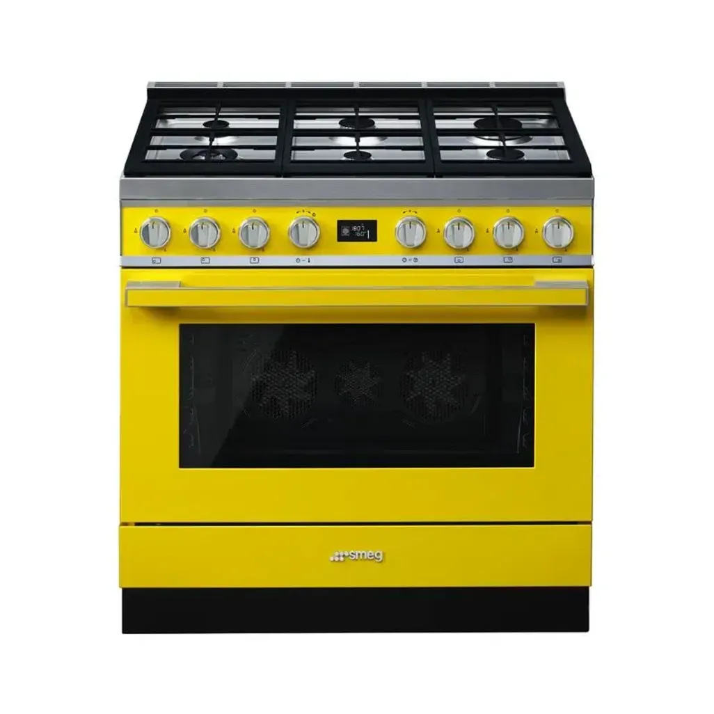 Bring Italian elegance and professional performance into your kitchen with the Smeg Portofino 90cm Yellow Gas /Electric Cooker. It is designed to stand out with its bold Yellow finish. This freestanding cooker combines style, power, and versatility, making it the perfect choice for passionate home chefs and busy families. Featuring 6 high-performance gas burners, giving you all the space and precision you require to prepare multiple dishes at once. The dual fuel design offers the best of both worlds with fast, responsive gas cooking on top and consistent, even heat distribution in the electric oven below. The 8 easy-to-use control knobs allow you to switch effortlessly between cooking settings so you can achieve perfect results every time.