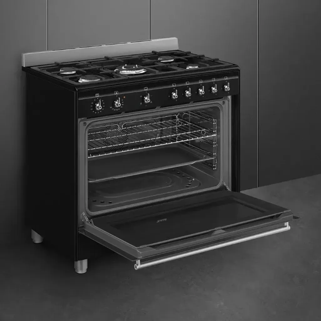 The dimensions of the Smeg 90cm Black Gas Cooker are H 900mm x W 900mm x D 600mm, and it has a 3-year guarantee.