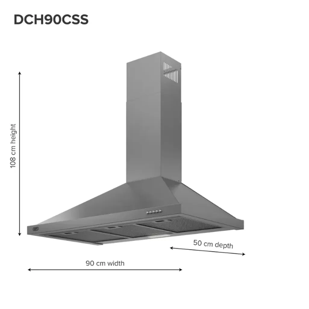 The dimensions of this Defy Chimney Cooker Hood are H 279mm x W 895mm x D 500mm, and it has a 2-year warranty.