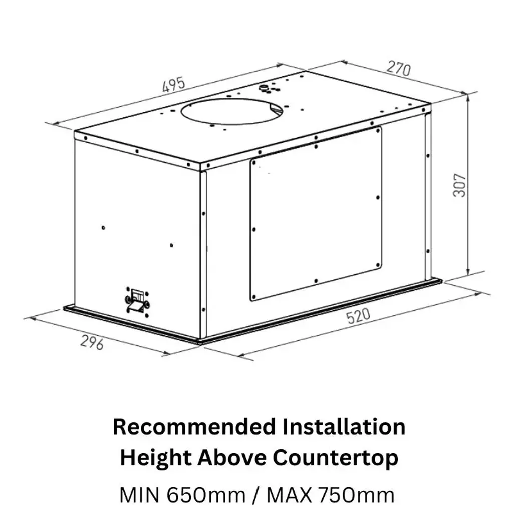 The dimensions of this Falco Integrated Extractor Fan are H 307mm x W 520mm x D 296mm.