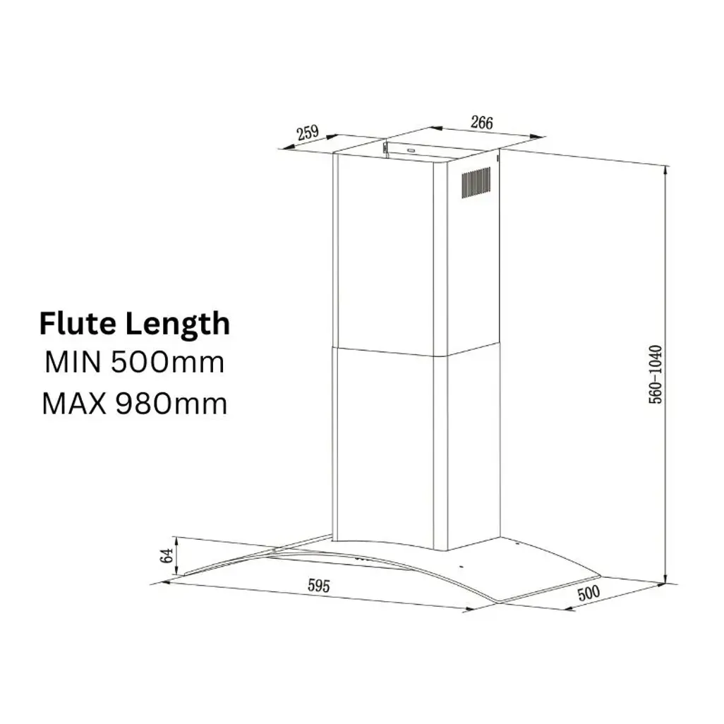 The dimensions of this Falco Wall Mount Extractor Fan are H 560mm - 1040mmx W 595mm x D 500mm.