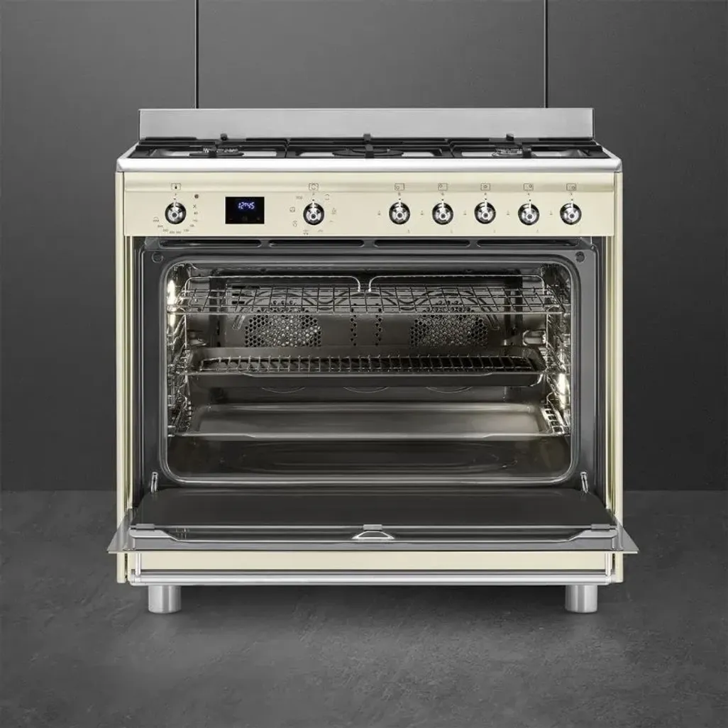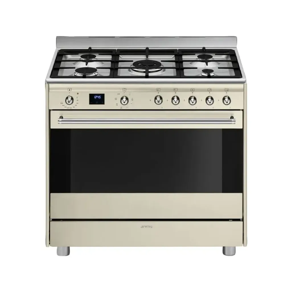The Smeg 90cm Cream Gas / Electric Cooker consists of a five-burner gas hob, with heavy-duty cast iron pan supports, and there is a 115L electric oven, with a triple glass door and halogen light.