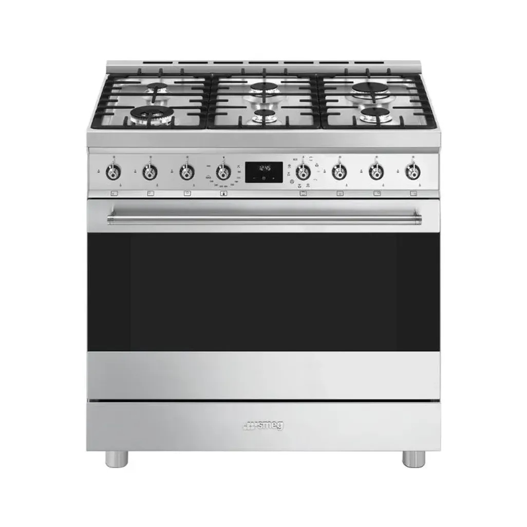 The Smeg 90cm Stainless Steel Gas / Electric Cooker consists of a six-burner gas hob, with heavy-duty cast iron pan supports, and there is a 115L electric oven, with a triple glass door and halogen lighting.
