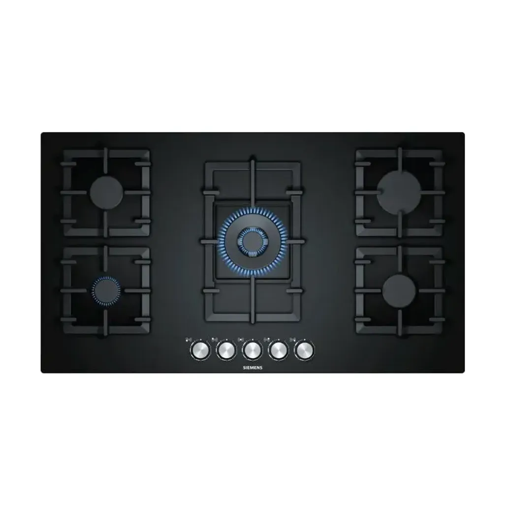 The Siemens 90cm Black Glass Gas Hob features four gas burners and a 4K wok burner, which allows you to cook a wide variety of meals in large quantities at once. This Siemens Gas Hob has a unique black tempered glass surface design, and there are continuous cast-iron pan supports.