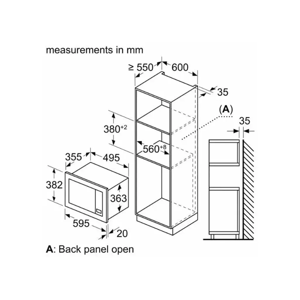 The dimensions of this Bosch Built-In Microwave Oven are 382mm x 595mm x 375mm, and this Bosch microwave has a 5-year warranty.
