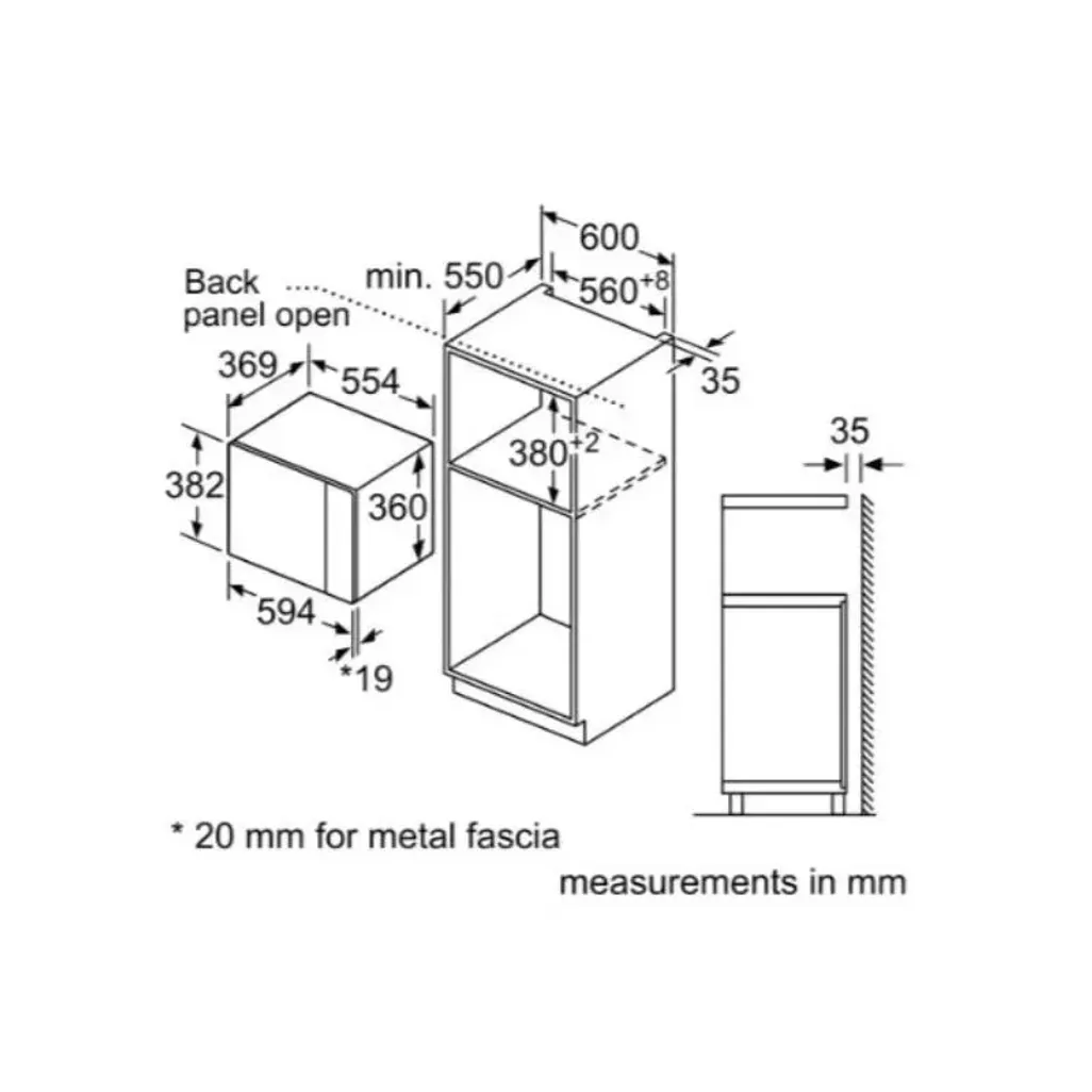 The dimensions for this Siemens 25L Built-In Microwave With Grill are H 382mm (380mm Minimum height for installation) x W 594mm (560mm minimum width) x D 388mm (550mm depth for installation). This microwave weighs 20.1kg and comes with a 5 year guarantee.