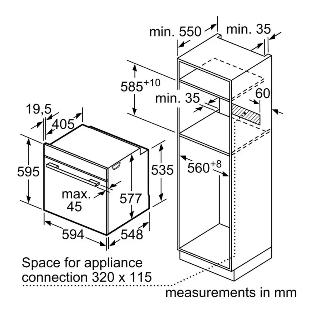 The dimensions of the Siemens IQ700 71L Built-In Oven are H 595mm x W 594mm x D 548mm and there is a 5-year guarantee.