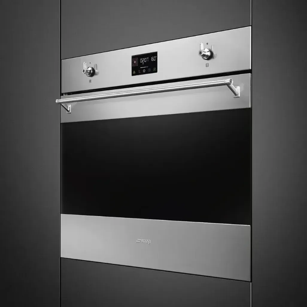 The dimensions of the Smeg 70cm Classica Built-In Oven are 595mm x 698mm x 548mm, and it has a 3-year guarantee.