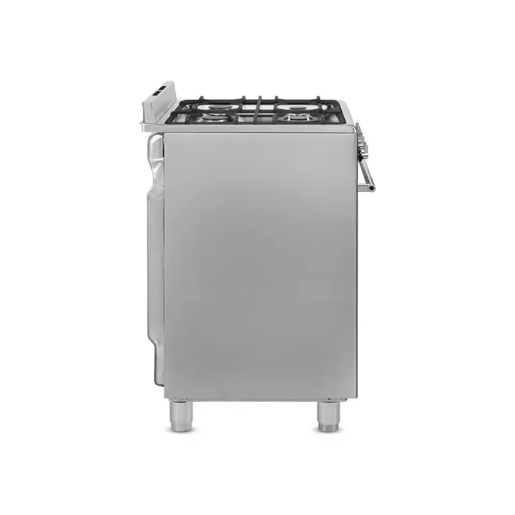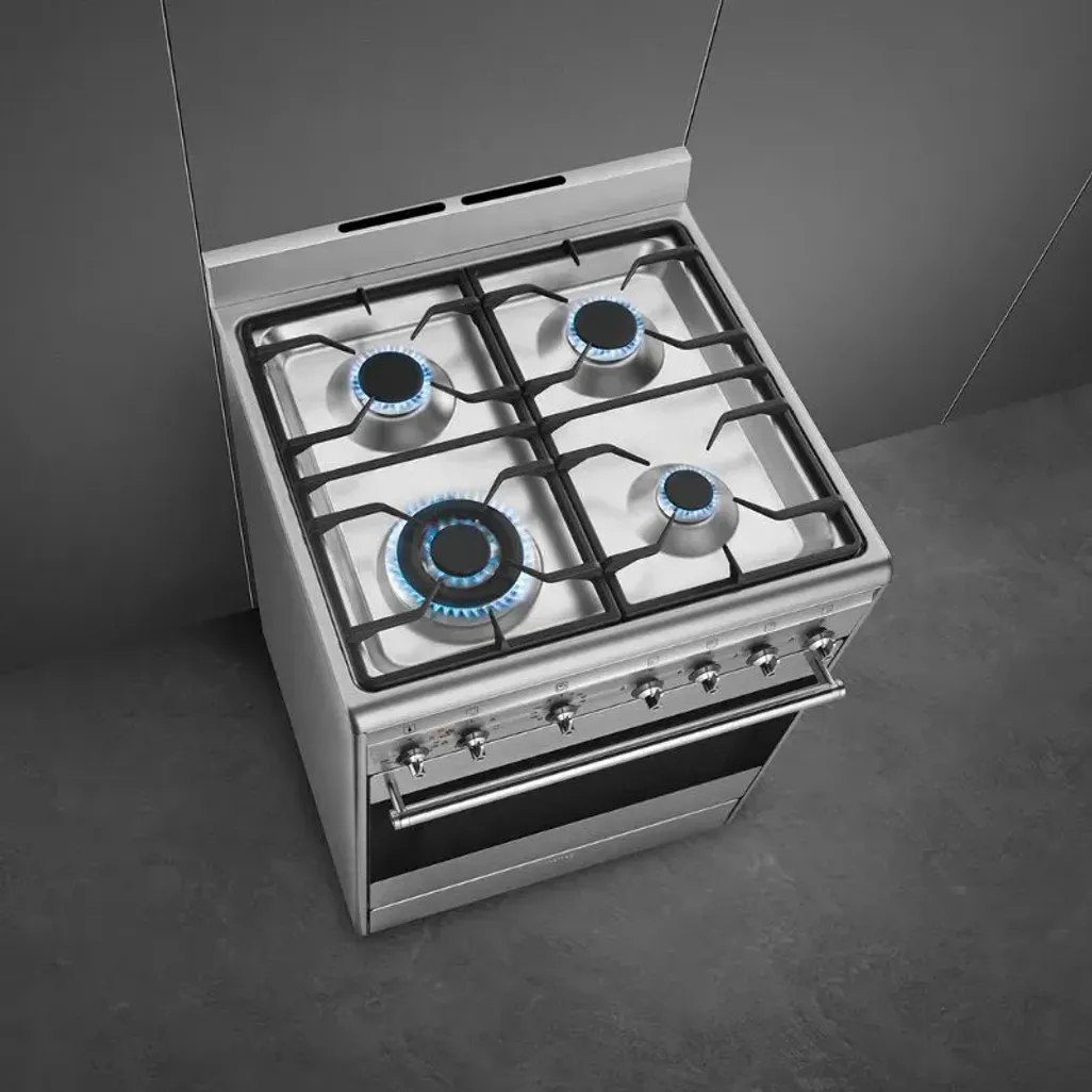The Smeg 60cm Stainless Steel Gas / Electric Cooker consists of a four-burner gas hob, with heavy-duty cast iron pan supports, and there is a 70L electric oven, with a triple glass door and halogen light.
