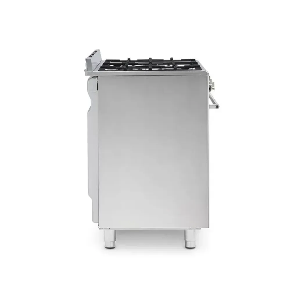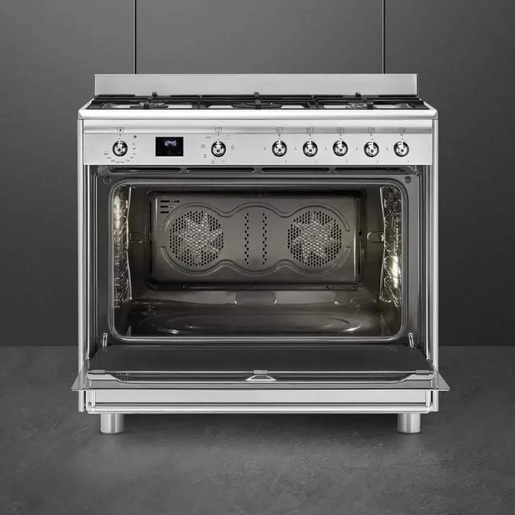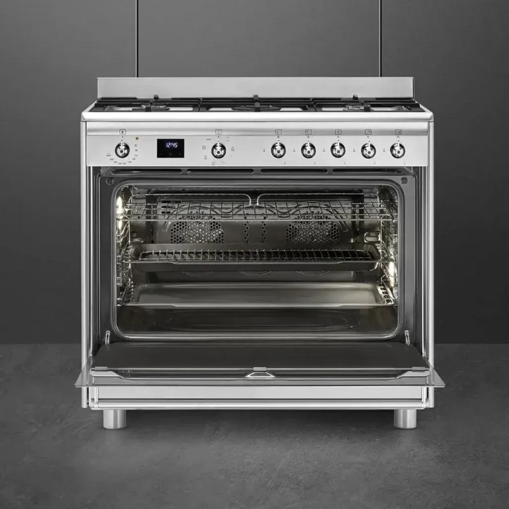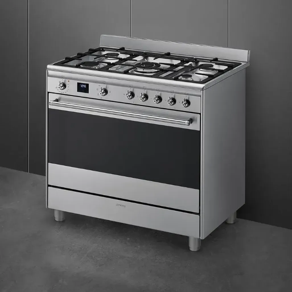 The Smeg 90cm Stainless Steel Gas / Electric Cooker consists of a five-burner gas hob, with heavy-duty cast iron pan supports, and there is a 115L electric oven, with a triple glass door and halogen light.