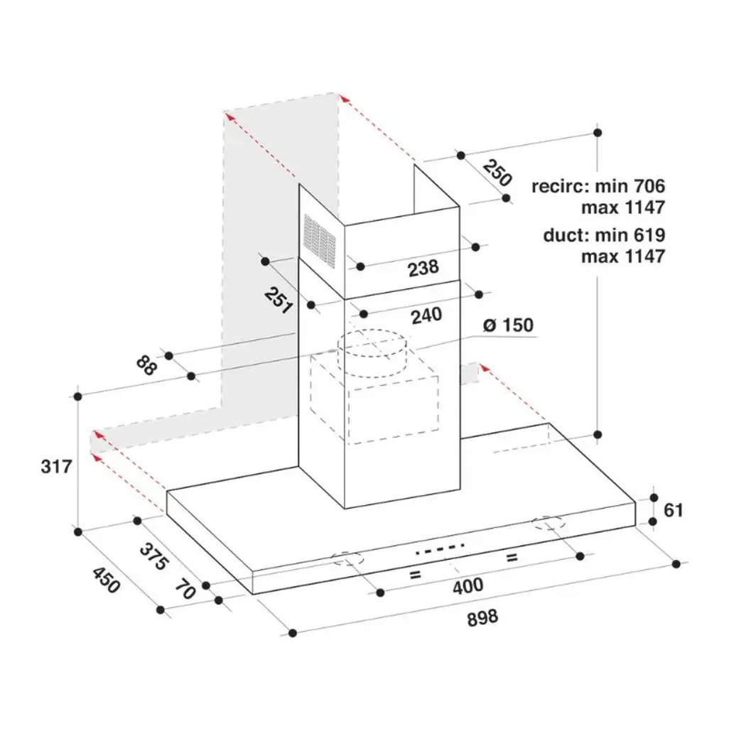 The dimensions of this Whirlpool T-Shaped Cooker Hood are H 619mm x W 898mm x D 450mm. The height of the cookerhood without the chimney is 60mm and the height of the chimney is 580mm.