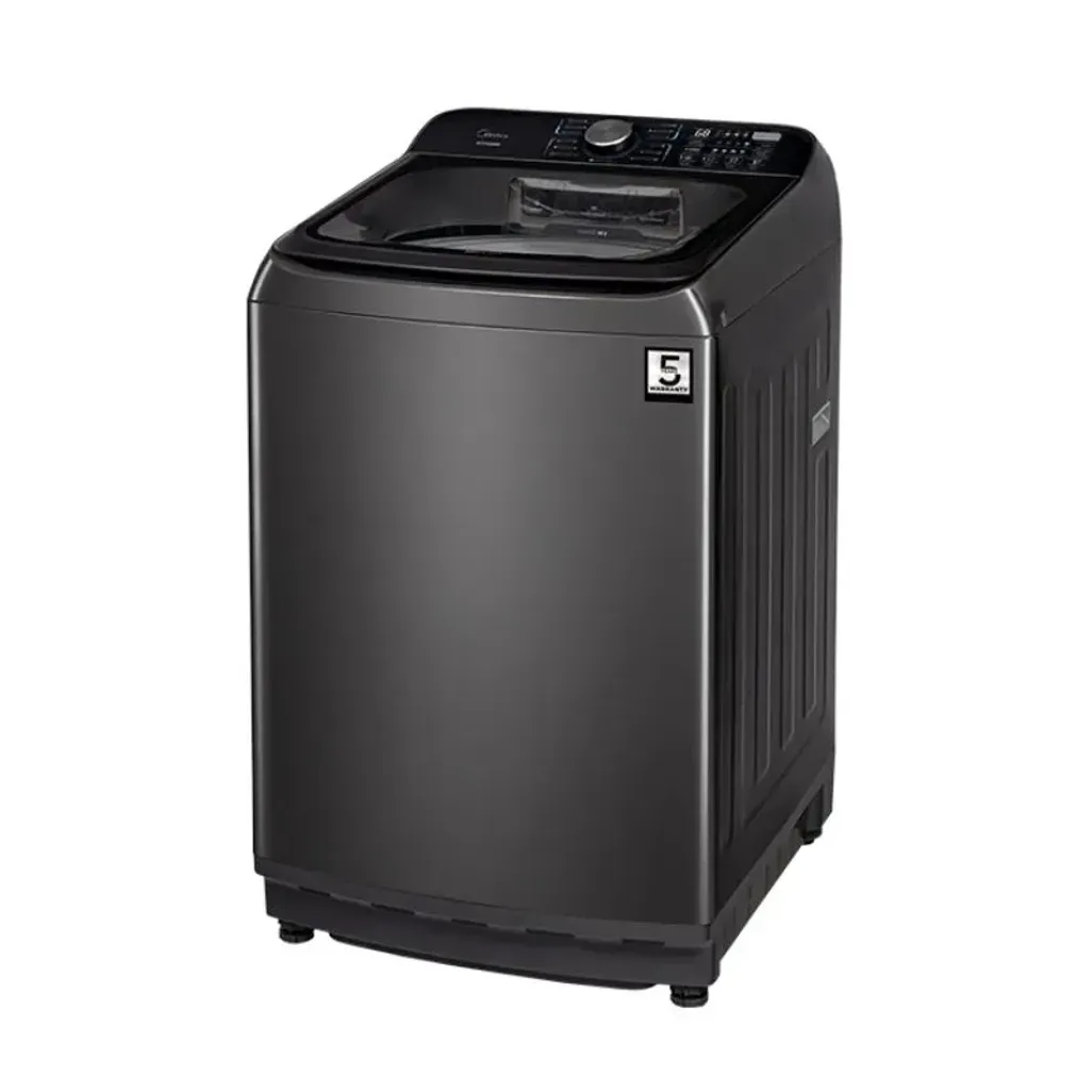 The dimensions of this Midea 16kg Top Loader Washing Machine are H 1050mm x W 615mm x D 601mm, and it has a 5-year warranty and a 10-year warranty on the Inverter Motor.