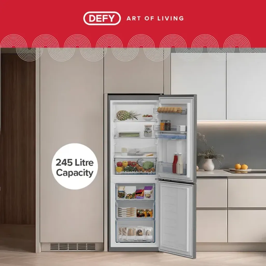 The dimensions of the Defy 245L Metallic Bottom Freezer are H 1600mm x W 540mm x D 587mm. This Defy Fridge Freezer combo has a 2-year warranty, and you can register for an additional 3-year warranty online.