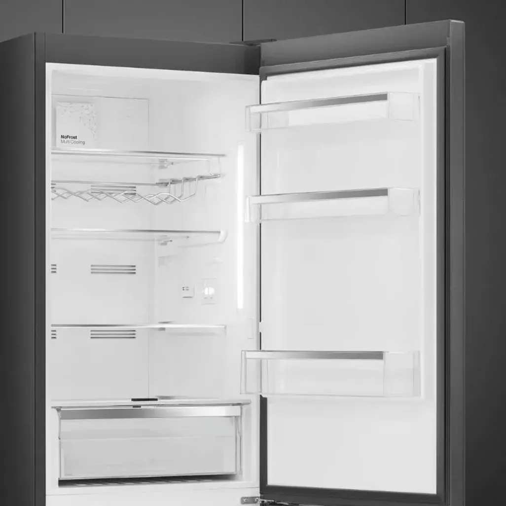 The Smeg 324L Dark Inox Bottom Freezer has a Multi-flow cooling system that distributes cold air evenly throughout the refrigerator compartment, thus ensuring the temperature is ideal for the storage of your food.