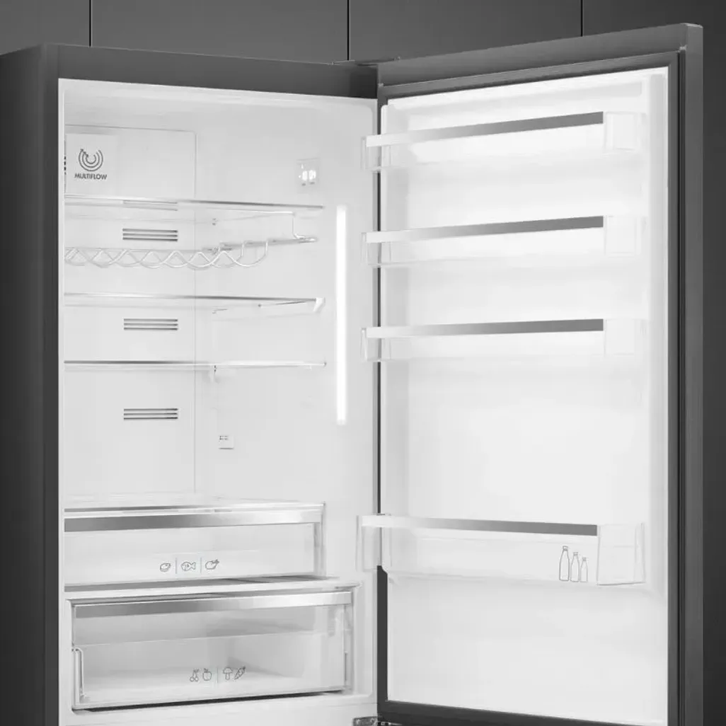 The Smeg 453L Dark Inox Bottom Freezer has a Multi-flow cooling system that distributes cold air evenly throughout the refrigerator compartment, thus ensuring the temperature is ideal for the storage of your food.