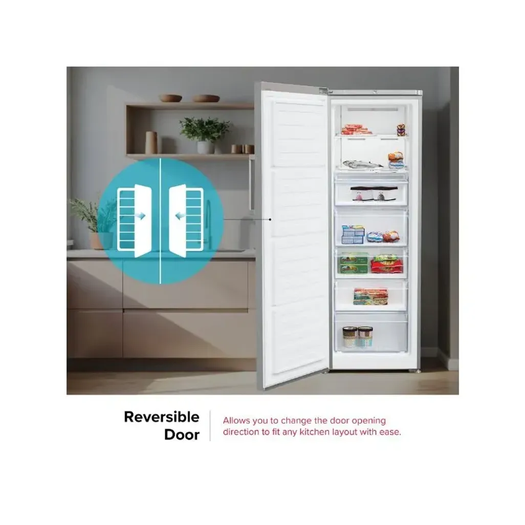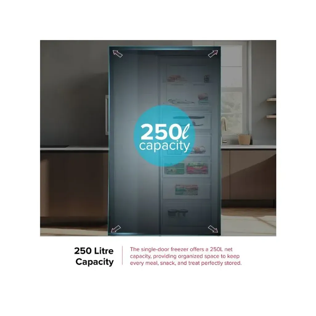 The Defy 250L Titanium Inox Upright Freezer combines modern design with energy efficiency, making it the ideal choice for families or small businesses needing dependable cold storage. With its A+ energy rating, it ensures optimal cooling while keeping electricity usage to a minimum.