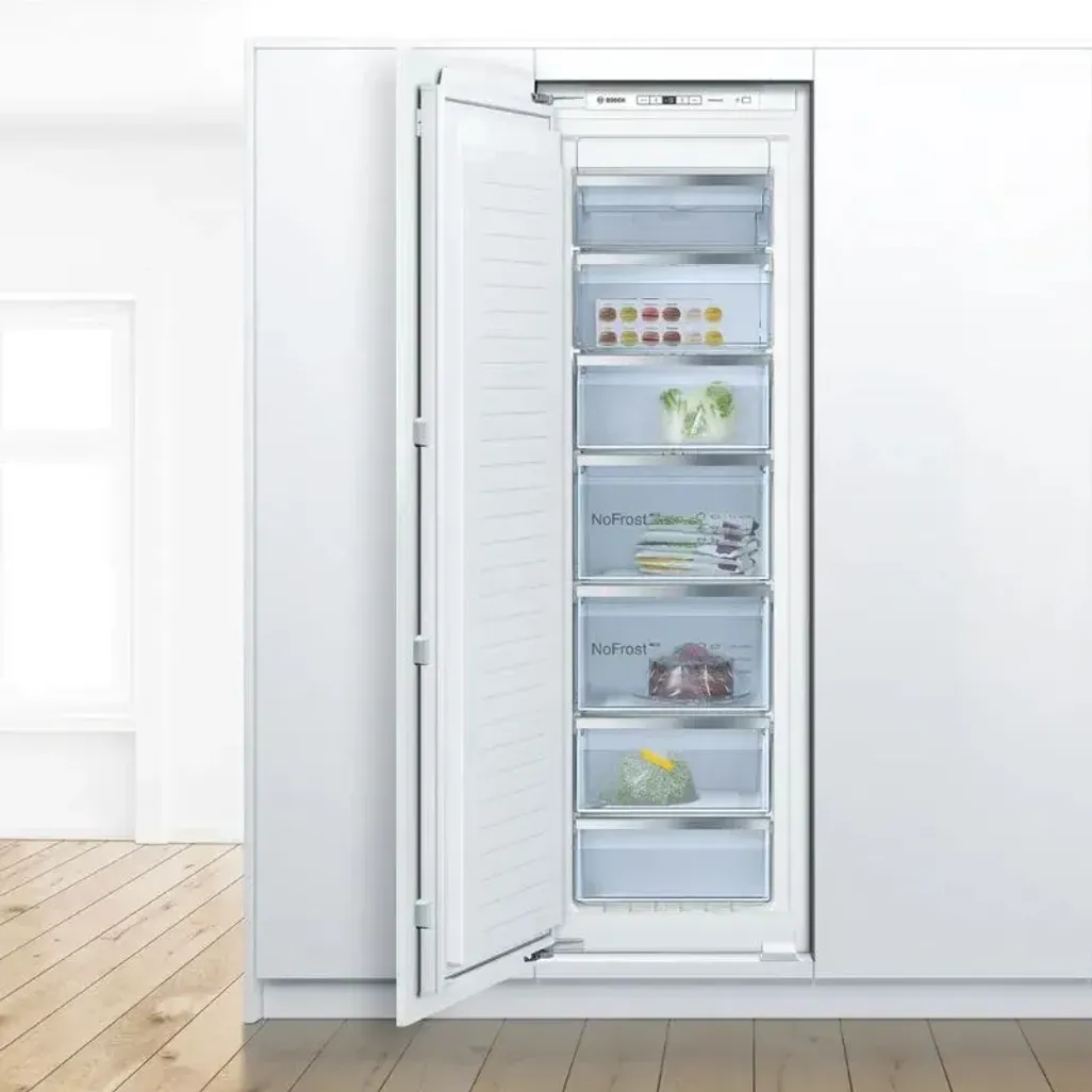 The Bosch 211L Built-In Upright Freezer features various space-saving solutions, including a Big Box drawer to provide you with enough space for storing large frozen goods, and you can remove the safety glass shelves to create more space.