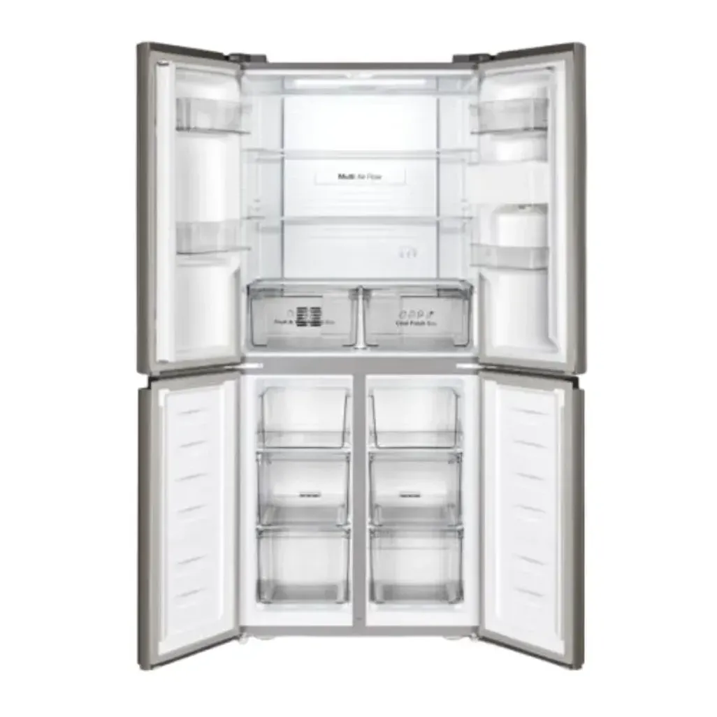 The dimensions of this Hisense 392L Inox French Door Fridge are H 1817mm x W 794mm x D 643mm, and it has a 2-year warranty.