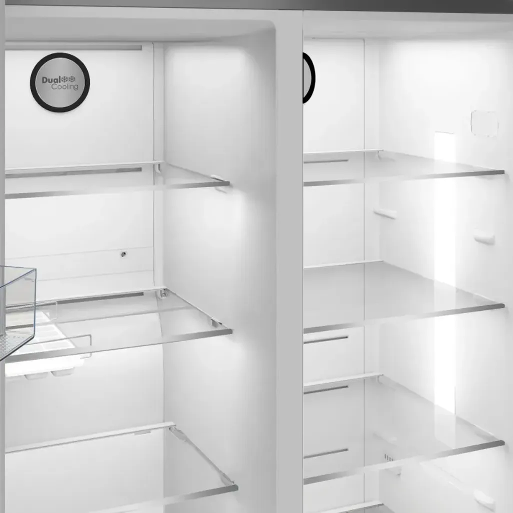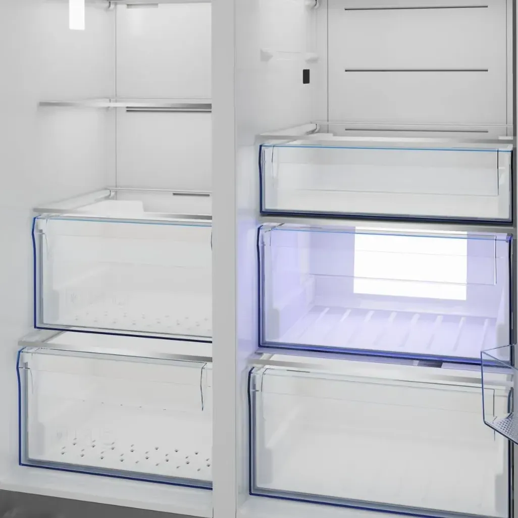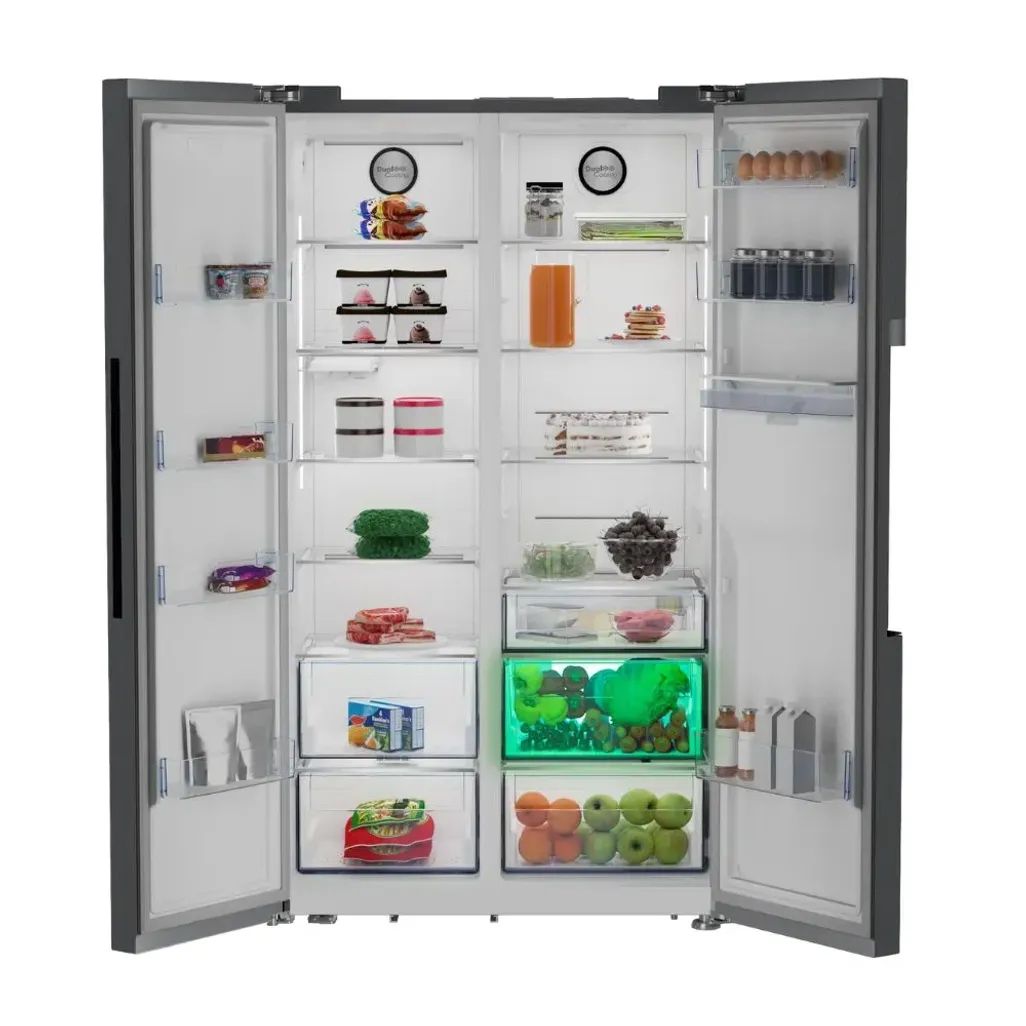 Upgrade your kitchen with the Defy 614L Naturelight Side By Side Fridge, a premium side-by-side appliance designed to keep your food fresher for longer while adding a modern touch to your home. Featuring an impressive 614L capacity, this fridge offers ample space for all your groceries, making it perfect for large families. The Dual Cooling Technology ensures optimal humidity levels in the fridge and freezer, preventing odour transfer while keeping your produce crisp and fresh. It is powered by NatureLight Technology, which simulates natural sunlight within the crisper, helping to preserve the nutrients and freshness of your fruits and vegetables for longer periods.