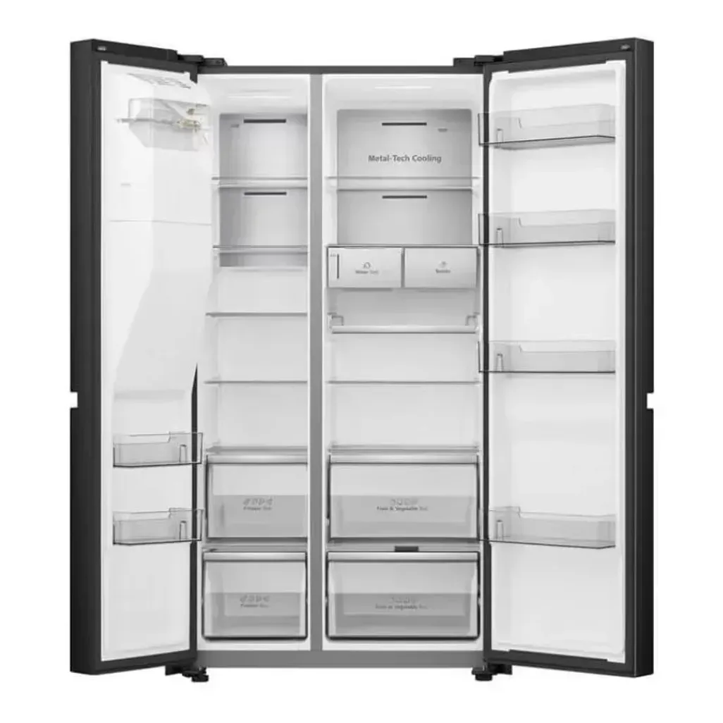 This Hisense Side By Side has a metal-tech cooling back wall, that will ensure even distribution of cool air from the inside out. The stainless steel overlaid back wall will ensure there a loss of cool air is prevented, and there will be no build-up of ice in the fridge.