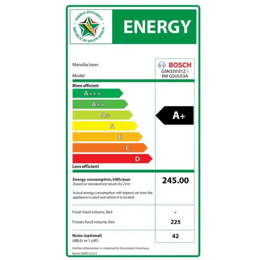 The dimensions of the Bosch Upright Freezer are H 1760mm x W 600mm x D 650mm, and this Bosch Freezer has a 3-year warranty.