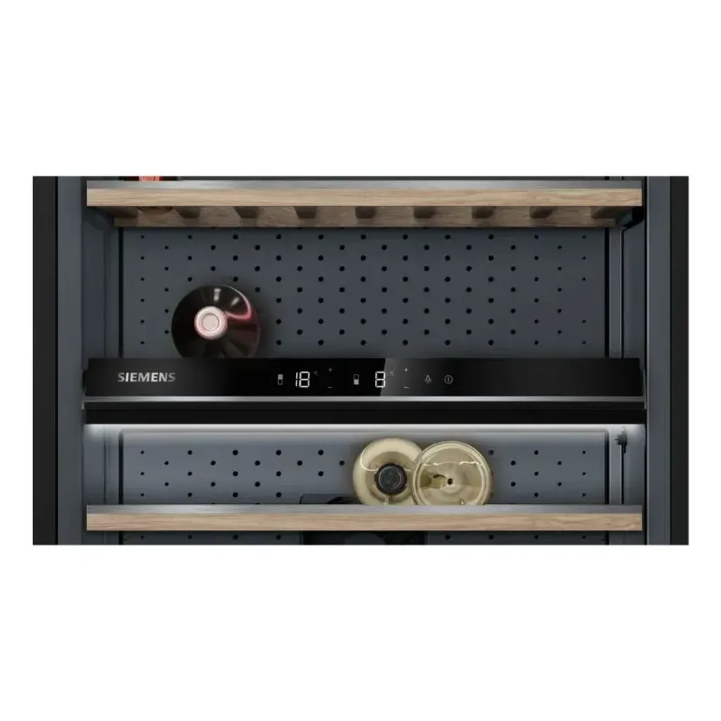 This Siemens Dual Zone Wine Cooler has a temperature range of 7°C - 19°C, making it ideal for storing all your favourite wines. The Siemens iQ500 wine cooler features a sleek black finish and gorgeous oak shelves, complementing the unit's look and feel. Additionally, LED lights illuminate your chilled section, offering a tantalising display of your beverages.