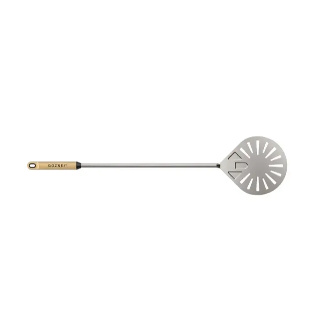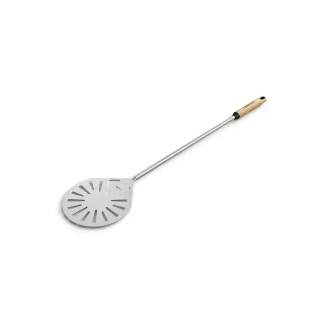 Enhance your pizza craft with the Gozney Balance Turning Peel, crafted for next-level performance. This turning peel features a tear-drop shaped (203mm), a stainless steel blade with holes that allow excess flour to fall away, delivering a perfectly crisp crust without a burnt aftertaste. Its design ensures a smooth experience when turning or transferring your pizza with precision. The (900mm) length provides ample reach, while the FSC-Beech wood handle offers a timeless, comfortable grip.