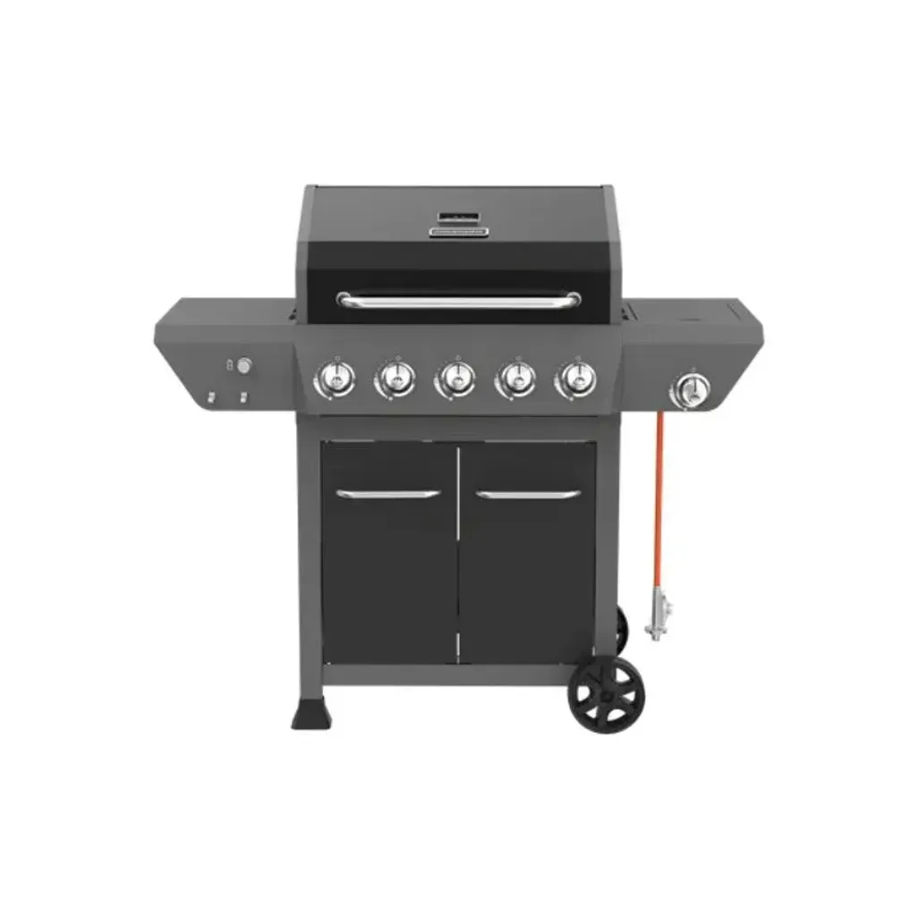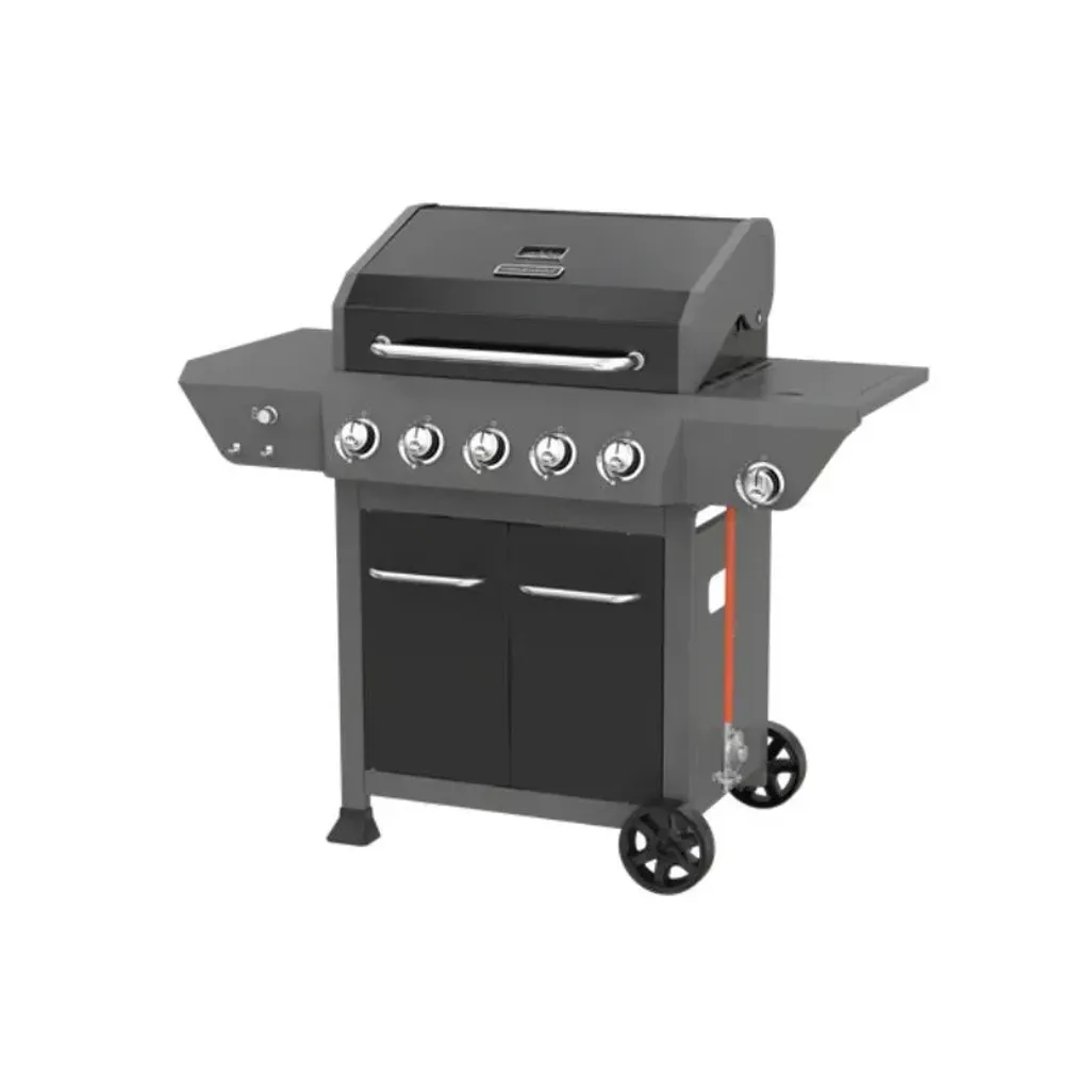 The Megamaster Onyx Series 5 Burner Patio Gas Braai offers five stainless steel burners with a total heat output of 50,000 BTUs. It has two wheels for easy movement from your garage to your patio and back to your garage.