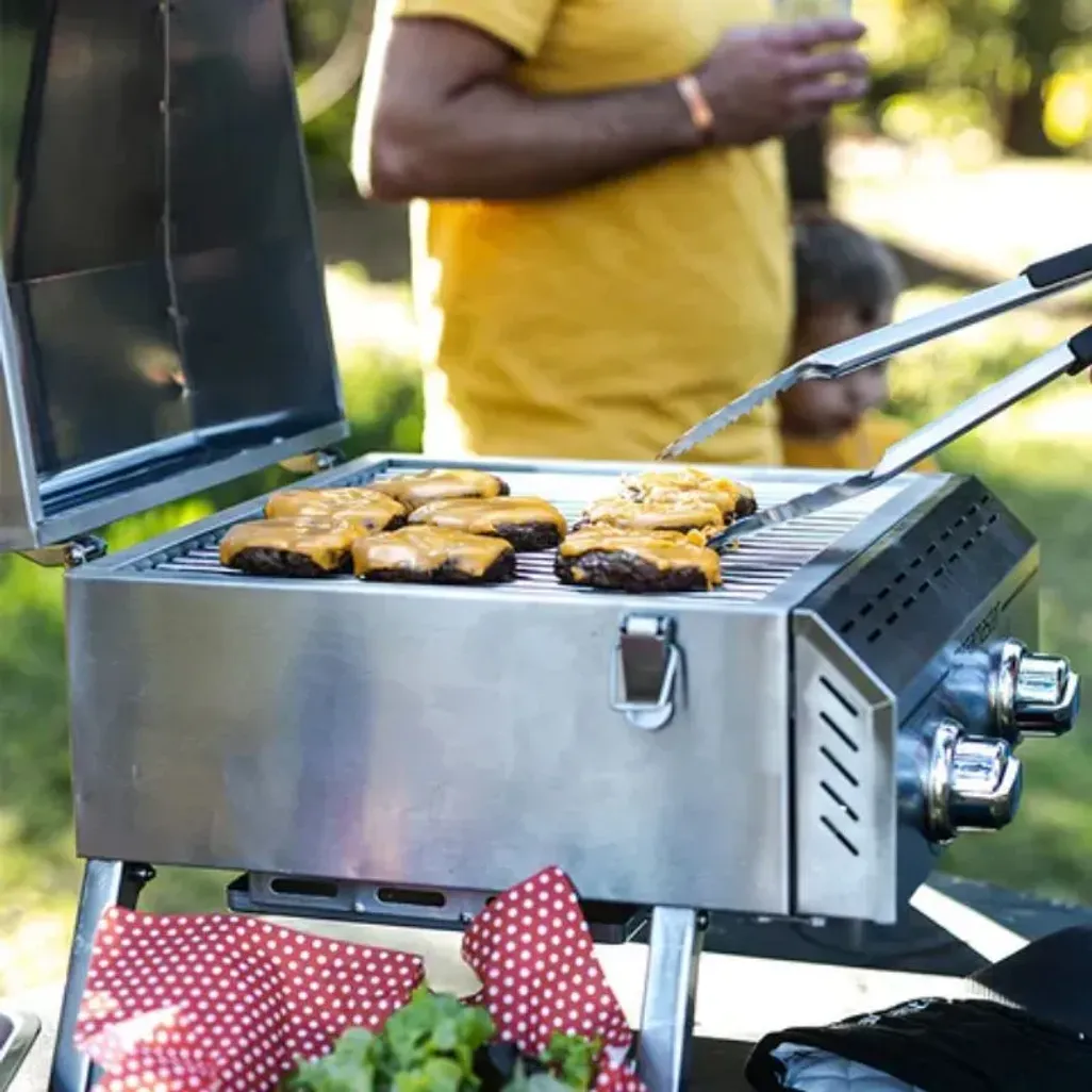 The Origin Series 2 Burner Tabletop Gas Braai boasts 1289 cm² of total cooking space with two stainless steel burners, supplying 16 000 BTU's of flame-roasting energy.