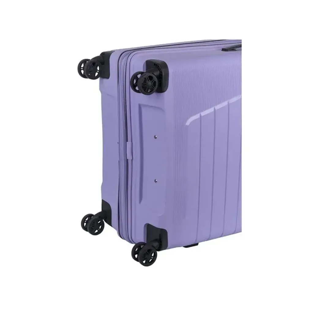 For added convenience, the fitted Trakpouch securely stores your luggage tracking device, giving you peace of mind while you travel. Effortlessly glide through your journey on 4 double wheels with the Cellini Starlite Lilac Medium 4 Wheel Trolley Bag, a stylish and practical companion for any adventure.