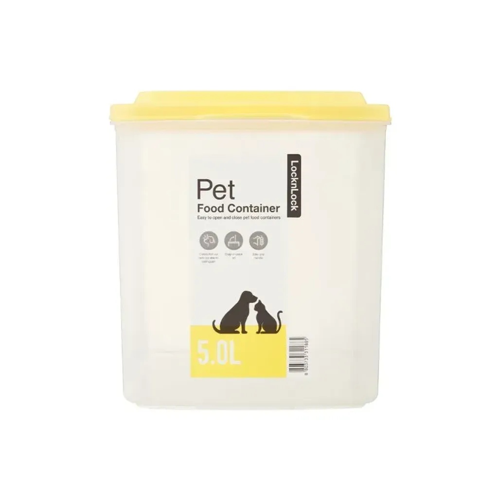 This Dry Food Container is made of Polypropylene Plastic (PP). It has a yellow design, which is one of the colours that dogs are able to discern. The LocknLock Pet container has a 5L capacity, and a space-saving slim body design.