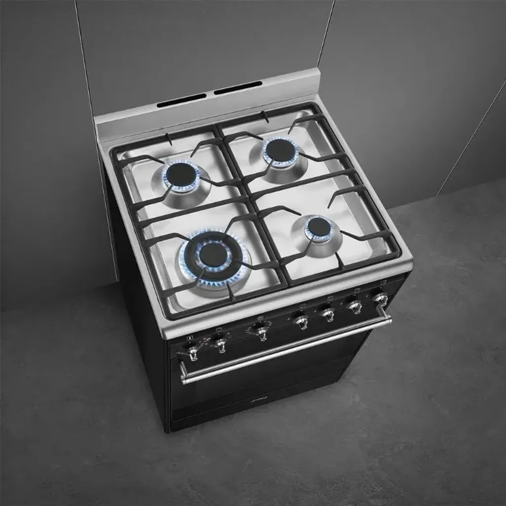 The Smeg 60cm Glossy Black Gas / Electric Cooker consists of a four-burner gas hob, with heavy-duty cast iron pan supports, and there is a 70L electric oven, with a triple glass door and halogen light.