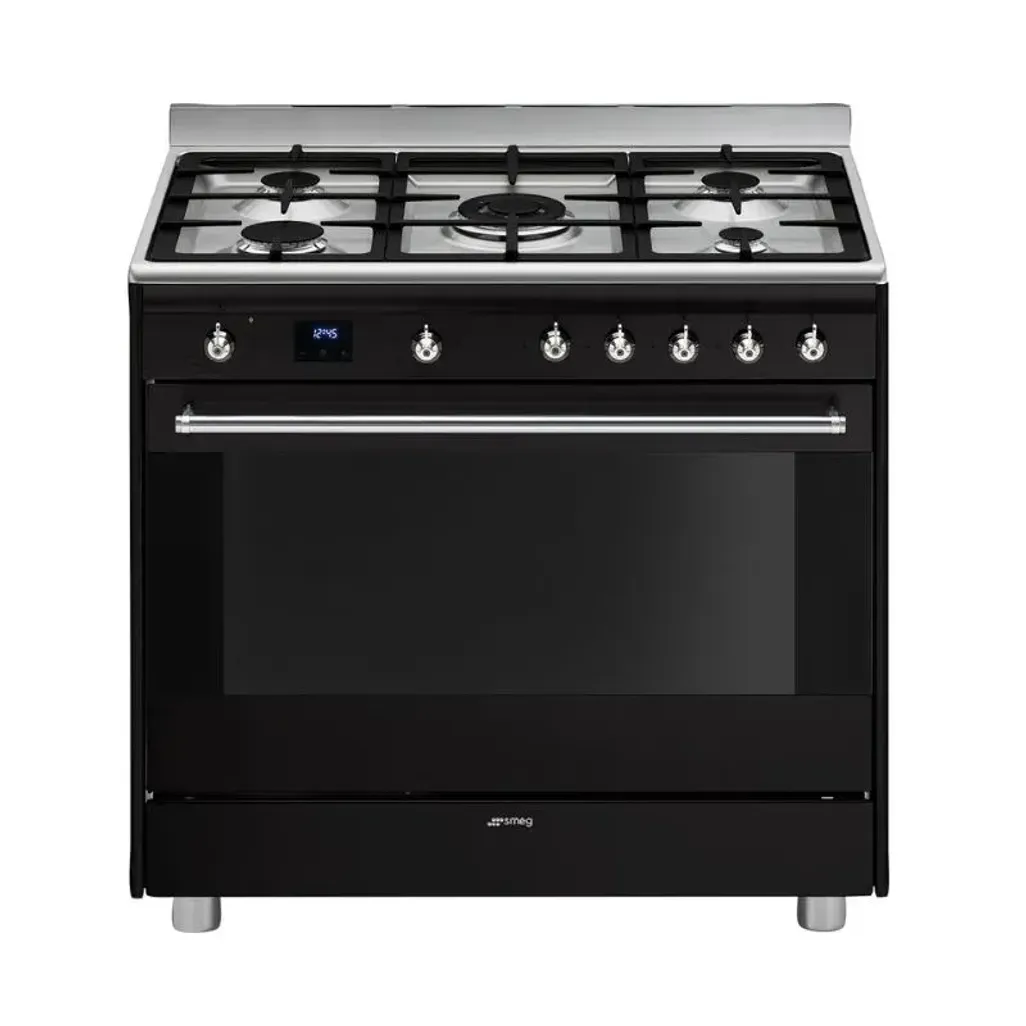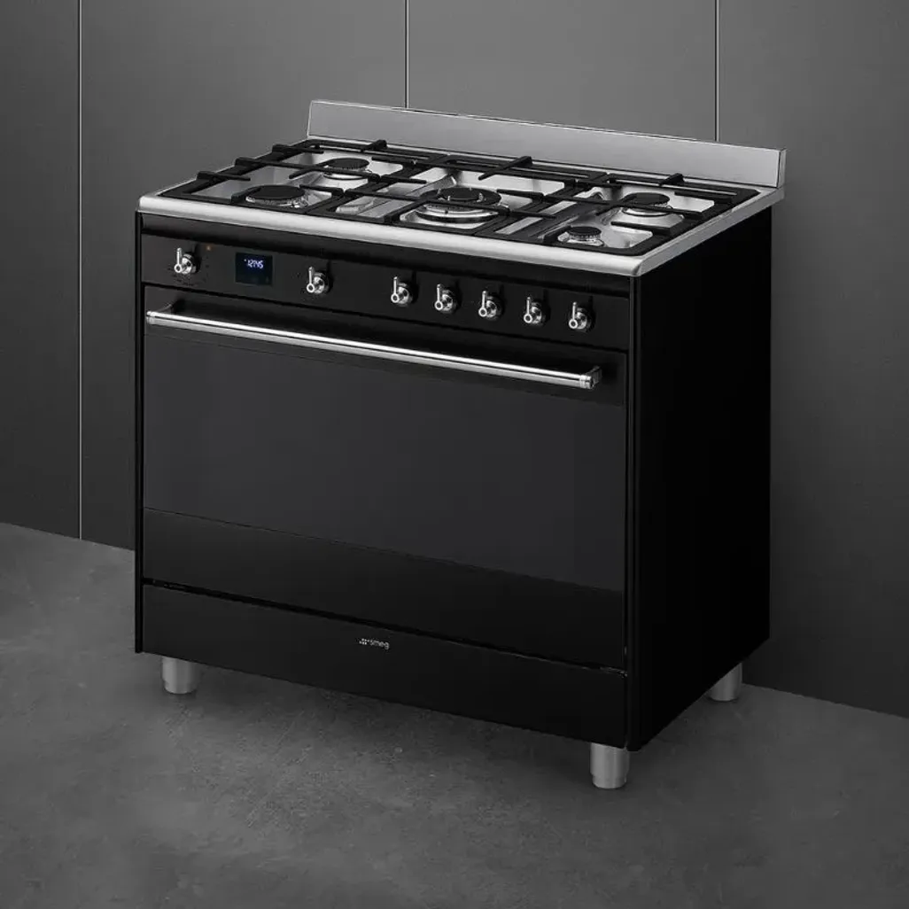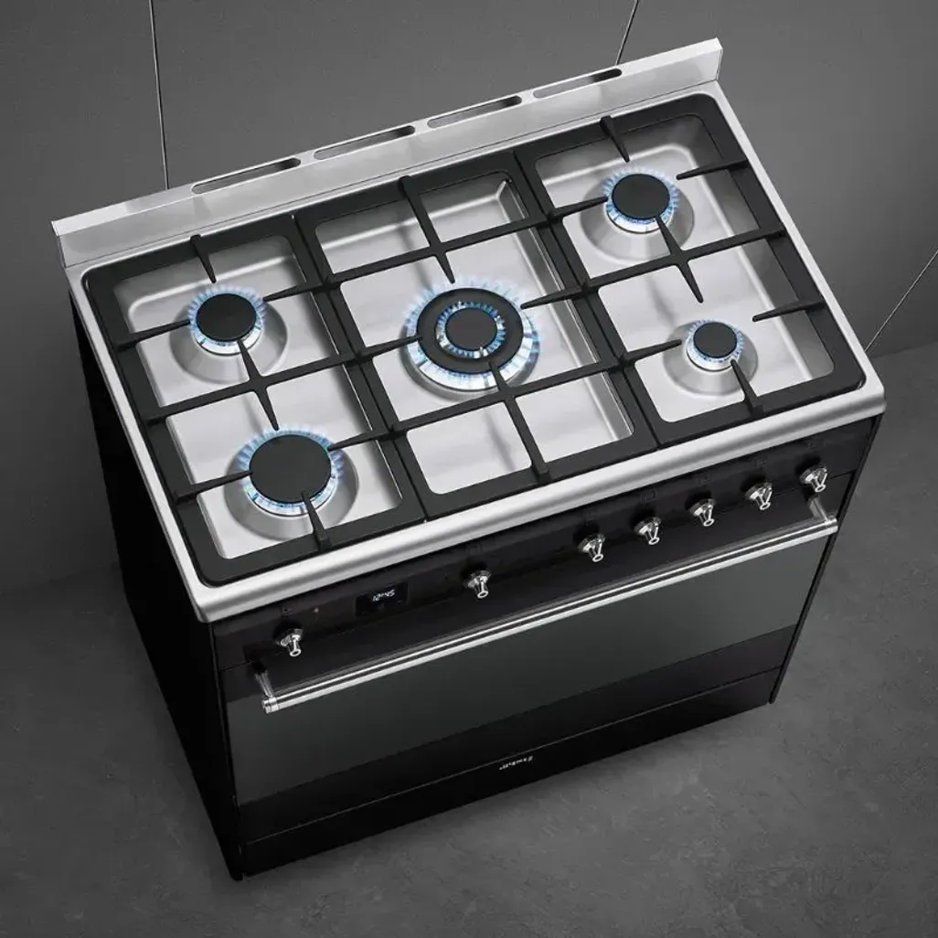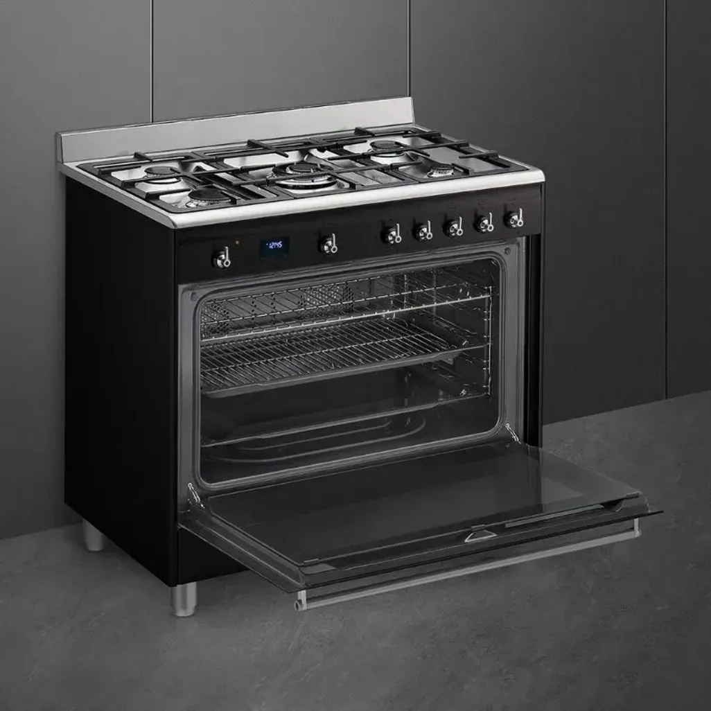 The Smeg 90cm Glossy Black Gas / Electric Cooker consists of a five-burner gas hob, with heavy-duty cast iron pan supports, and there is a 115L electric oven, with a triple glass door and halogen light.