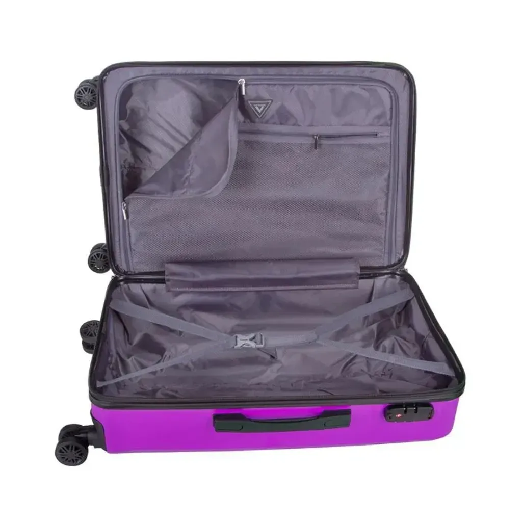 The dimensions of this Voyager Mahe Purple Large Trolley Case are H 75cm x W 46cm x D 30.5cm, and it has a 3-year warranty.