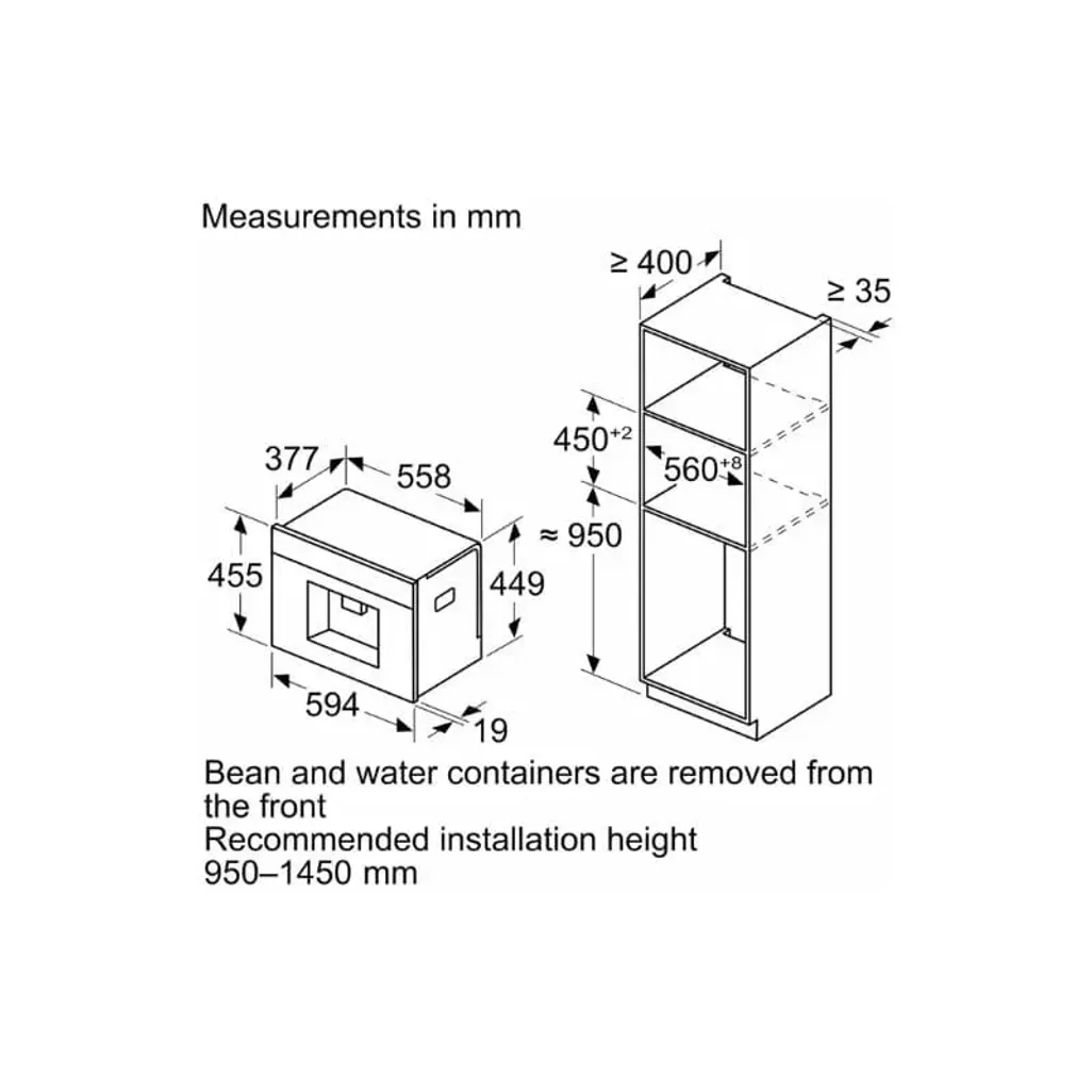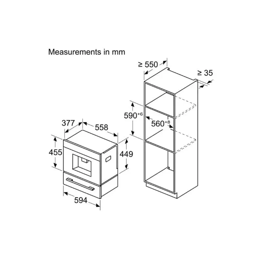 The dimensions of the Bosch Series 8 Built-In Automatic Coffee Machine are H 455mm x W 594mm x D 385 mm, and it has a 3-year guarantee.