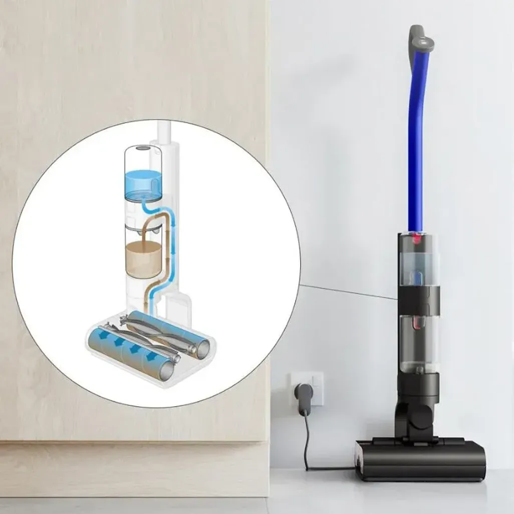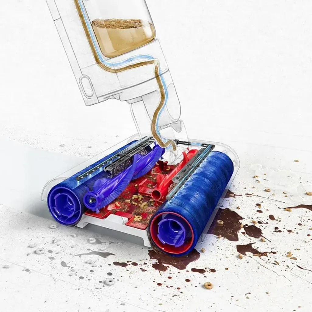 The Dyson WashG1 Wet Floor Cleaner features two motorised counter-rotating microfibre rollers that will remove both wet and dry dirt at once. By doing so, the rollers will extract dirt before evenly hydrating from start to finish. If you need to change direction as you move around furniture, this Dyson Wet Floor Cleaner can easily be maneuvered around your furniture and reach awkward spaces.